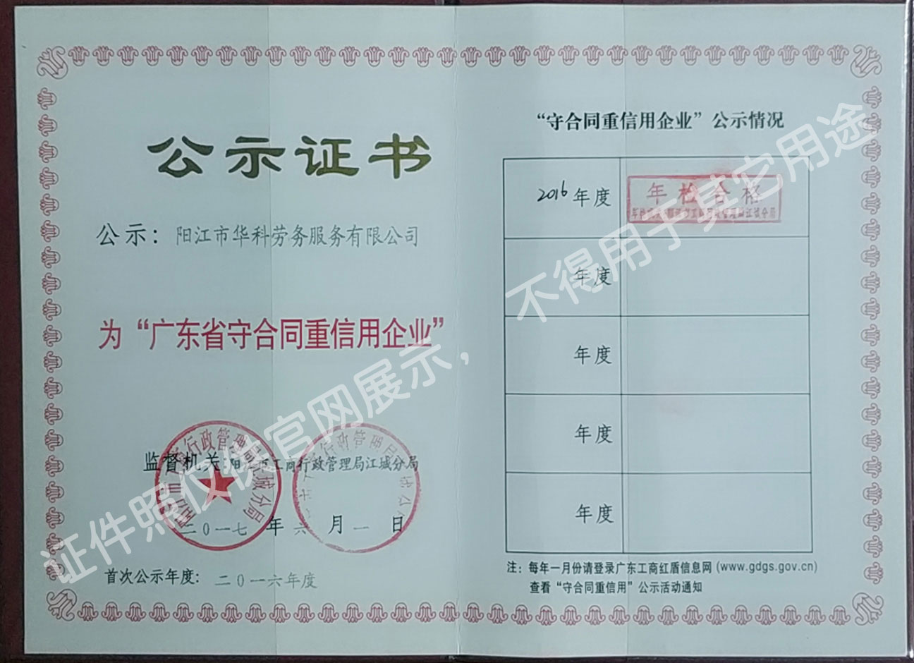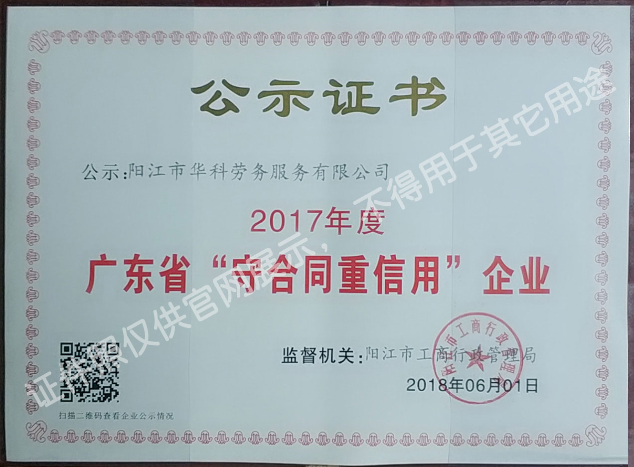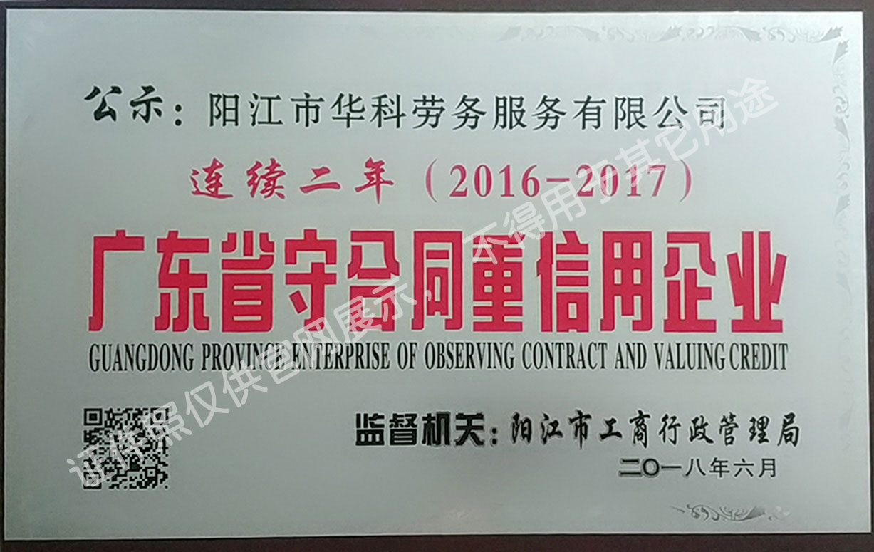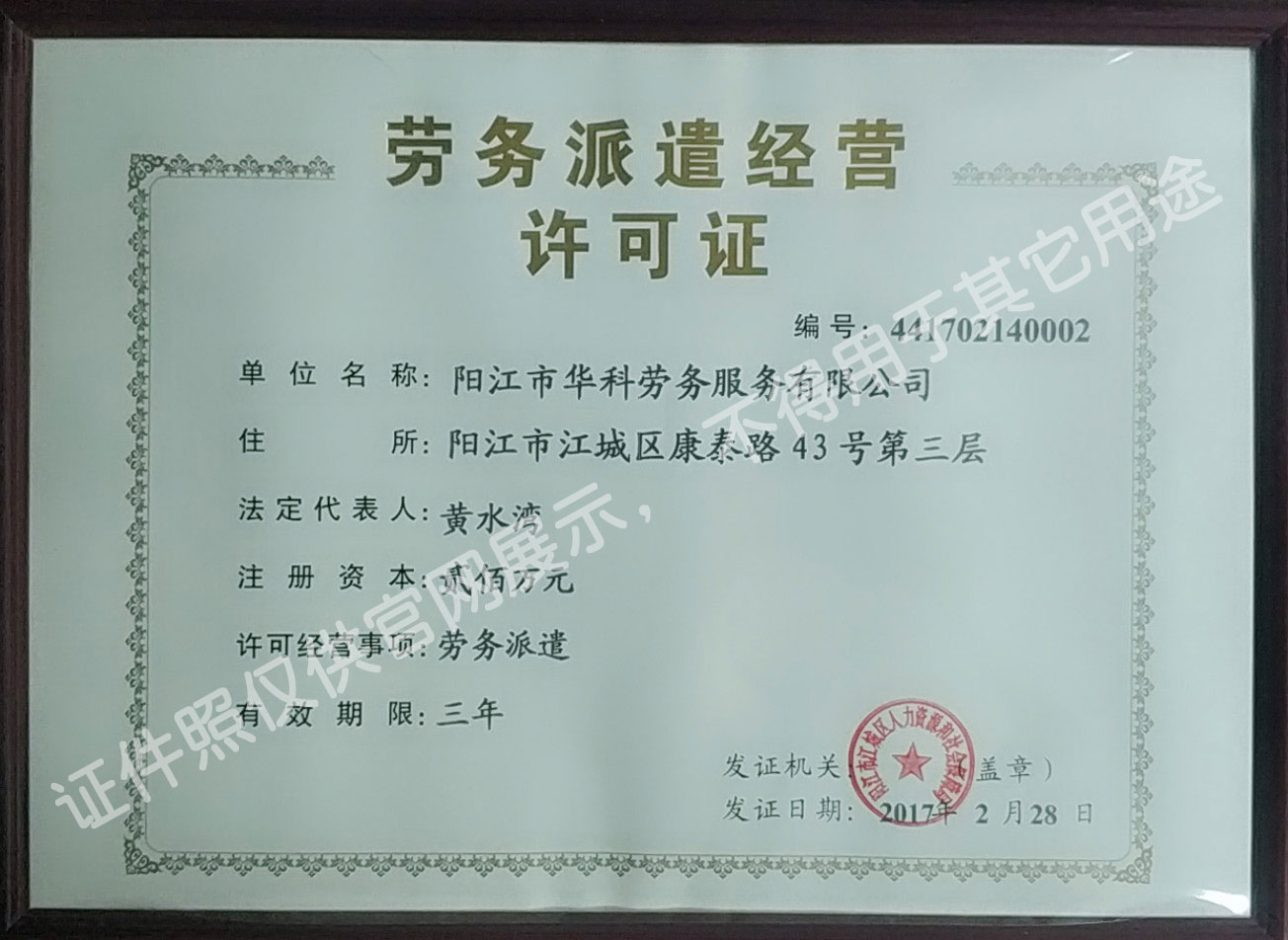 華科勞務(wù)服務(wù)有限公司是專業(yè)從事人事代理、勞務(wù)租賃、人力派遣及管理的綜合性服務(wù)機(jī)構(gòu),是首批獲得廣東省人力資源廳、陽江市勞動和社會保障局頒發(fā)人力資源許可證的合法單位。公司秉承“誠信務(wù)實(shí)、專業(yè)熱情、滿意第一、服務(wù)社群”的經(jīng)營理念,在勞務(wù)派遣業(yè)務(wù)的基礎(chǔ)上,更致力于合同制工人(臨時(shí)工、實(shí)習(xí)生、假期工)方向發(fā)展,為用工企業(yè)及時(shí)輸送合格的各類人才,合理調(diào)配人力資源的有序流動,幫助求職者尋求更加滿意的就業(yè)渠道和崗位,切實(shí)維護(hù)求職者的合法權(quán)益。